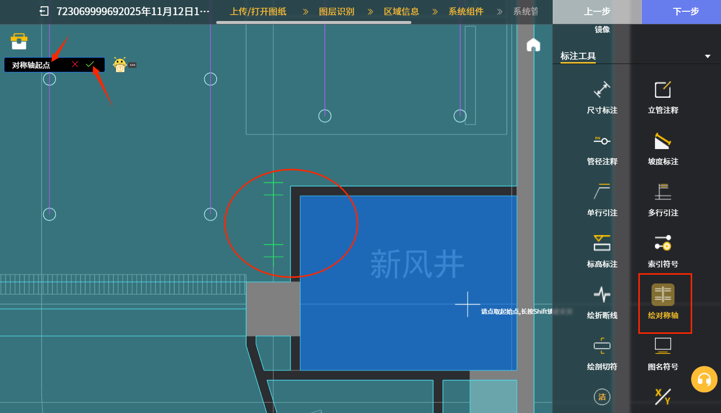 举例十:点“绘对称轴”图标后,下图十一中先选取对称轴的起点和终点,选好后点击箭头处“√”予以确认;此时椭圆红框内即生成对称轴符号。