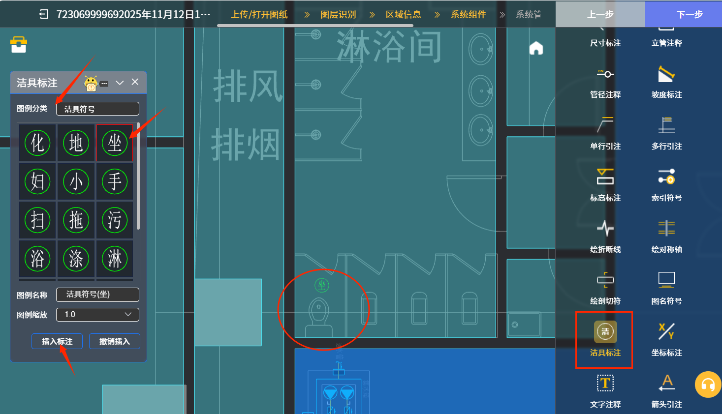 举例十三:点“洁具标注”图标后,在下图十四对话框中箭头处可以选择多种洁具的中文标注,比如坐便器可用圆圈内“坐”来表示;“图例缩放”栏内需确定缩放比例。随后点击箭头处“插入标注”图标,在卫生间坐便器附近就可以插入洁具标注了;椭圆红框内即为生成的操作结果。