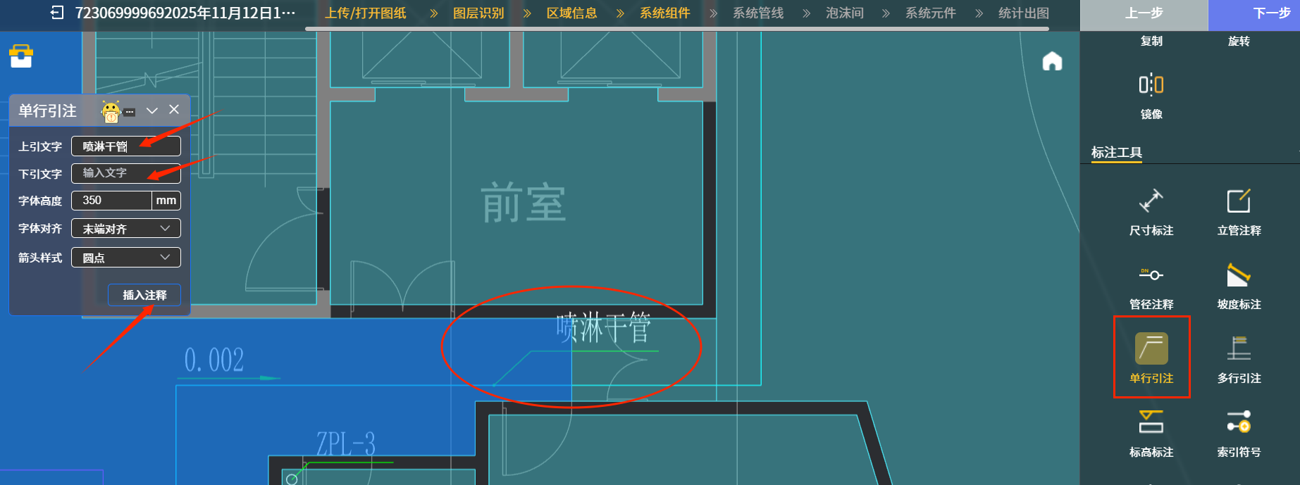 举例五:点“单行引注”图标后,下图六中可在箭头处对话框栏“上引文字”和“下引文字”2选项中输入文字,随后点击“插入注释”图标,同时引线紧贴要插入注释的管线,就可以进行注释插入了,椭圆红框内即为插入注释的操作结果。