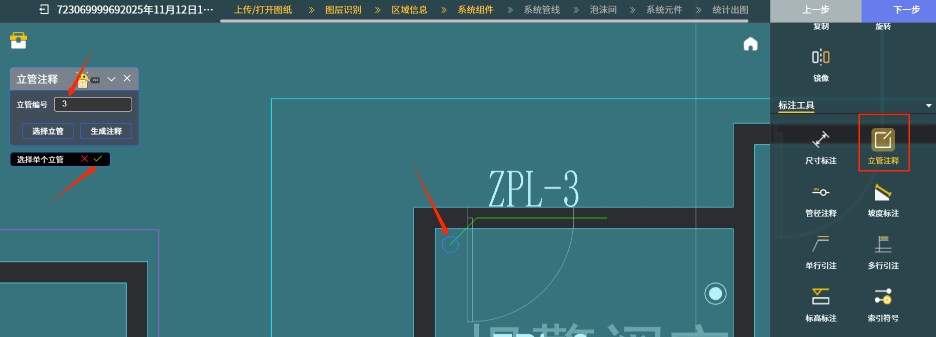 举例二:点“立管注释”图标后,下图三中箭头处可选择需要注释的立管,选好后点击“√”予以确认;此时箭头处“立管编号”栏中出现该立管的编号为“3”,最后点击“生成注释”键即完成操作。这个图标主要是对已有立管进行编号注释用的,方便系统的识别和区分。