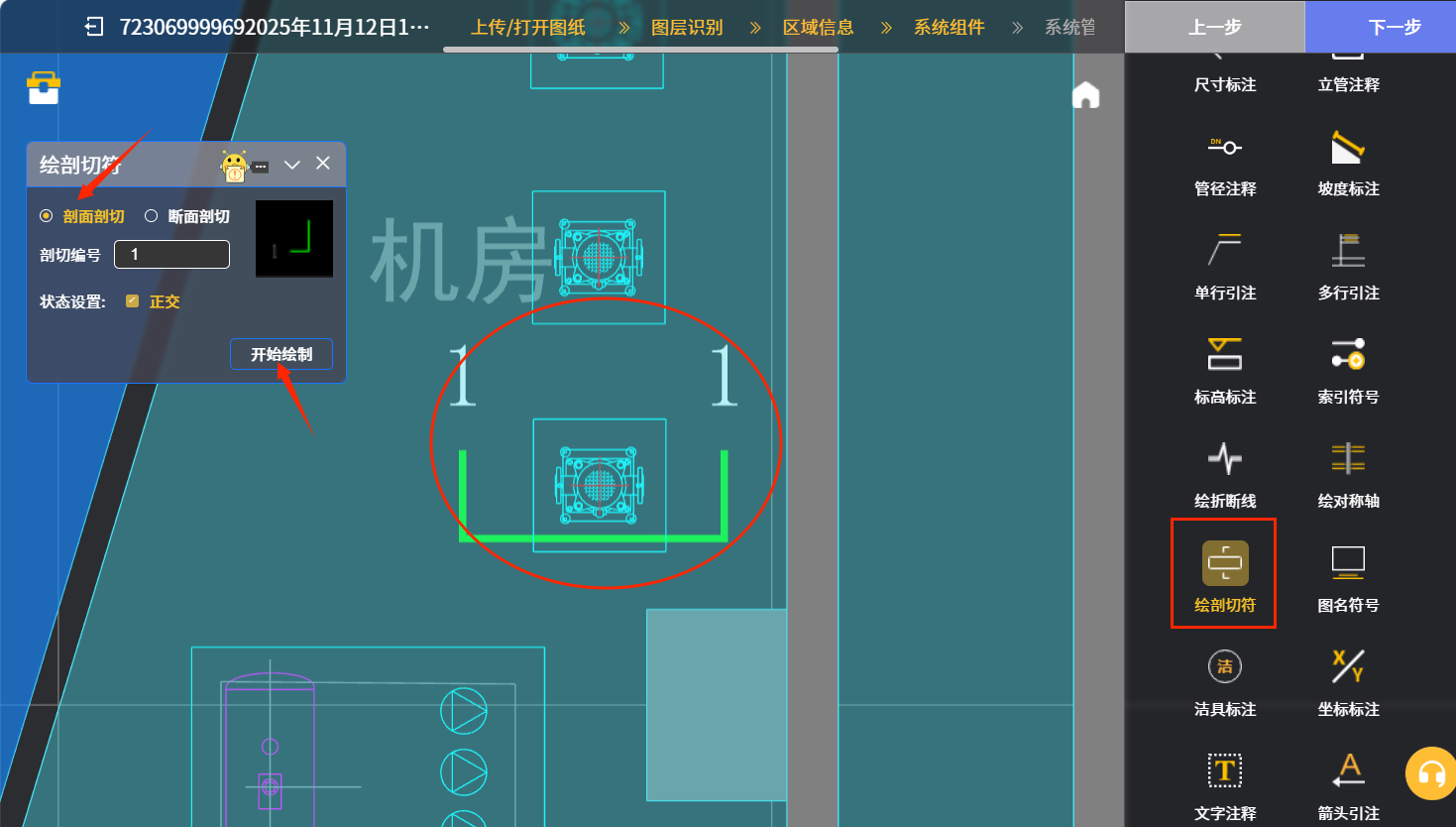 举例十一:点“绘剖切符”图标后,在下图十二中对话框中箭头处点选“剖面剖切”或“断面剖切”选项,同时在“剖切编号”等选项中输入编号数字;随后点击“开始绘制”图标,在需要绘制剖切符的区域确定第一个和第二个剖切点,就可以进行剖切符绘制了,椭圆红框内即为生成的操作结果。