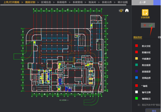 “点击上传图纸”或“点击打开图纸”图标后,系统进入“图层识别”页面。这个页面主要是要对上传的建筑图纸进行要素和区域识别,比如识别建筑图纸上的房间,楼梯,轴线,柱子,楼梯,防火分区,防烟分区等;点击页面右上角“识别范围”图标后,页面出现下图一右上角图标,此时需要框选需识别的图纸,然后点击箭头处的“√”图标以便确认所选区域。