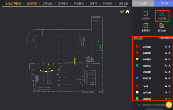 继续点击下图二右上角处“自动识别”图标后,所框选的识别范围内各种建筑元素都可以自动识别;如果原来建筑图层的划分不够清晰,也可以在下图二“图层指定”红框内进行建筑各元素的指定。